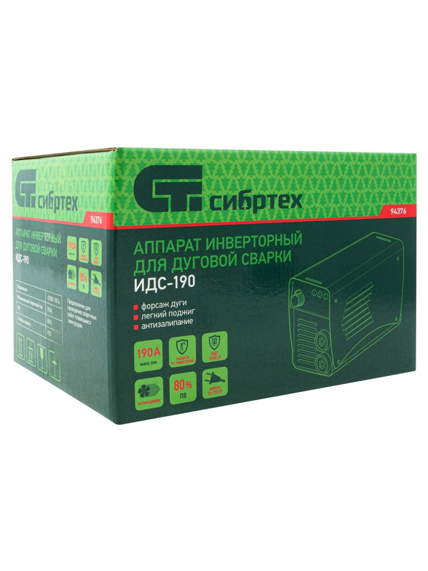 Сварочный аппарат инверторный СИБРТЕХ 94376, дуговой, ИДС-190, 190 А, ПВ 80%, диаметр электрода 1.6-4