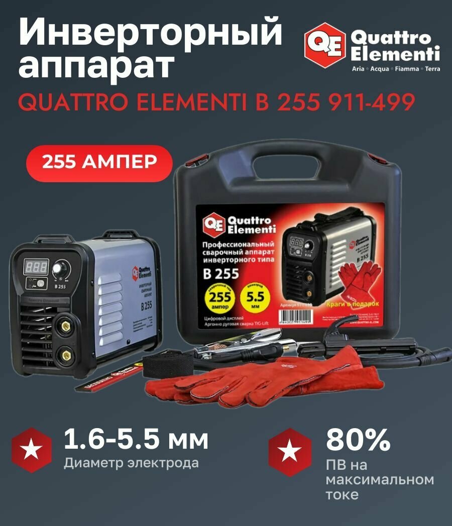 Аппарат электродной сварки инвертор QUATTRO ELEMENTI B 255 255 А ПВ 80 до 5.5 мм 5.6 кг Дисплей TIGLift от 160В кейс