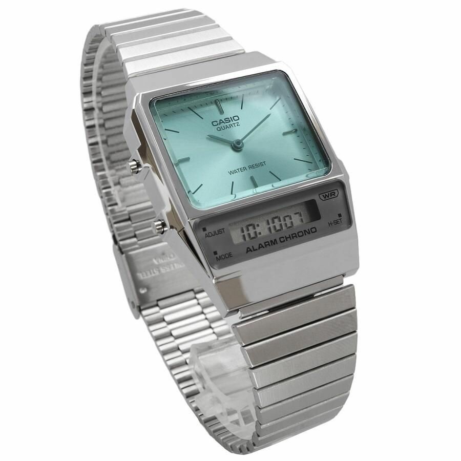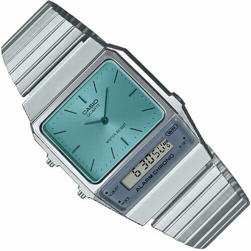 AQ-800E-3A Casio наручные часы кварцевые WR30 (3 атм) мужские, женские серебряный, зеленый секундомер будильник отображение числа, второй часовой пояс, отображение дня недели, отображение месяца акриловое стекло