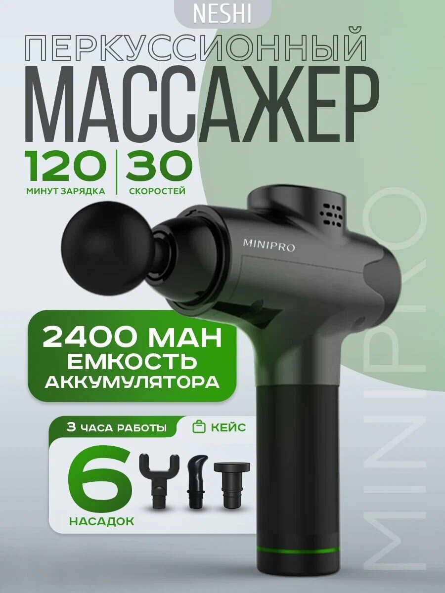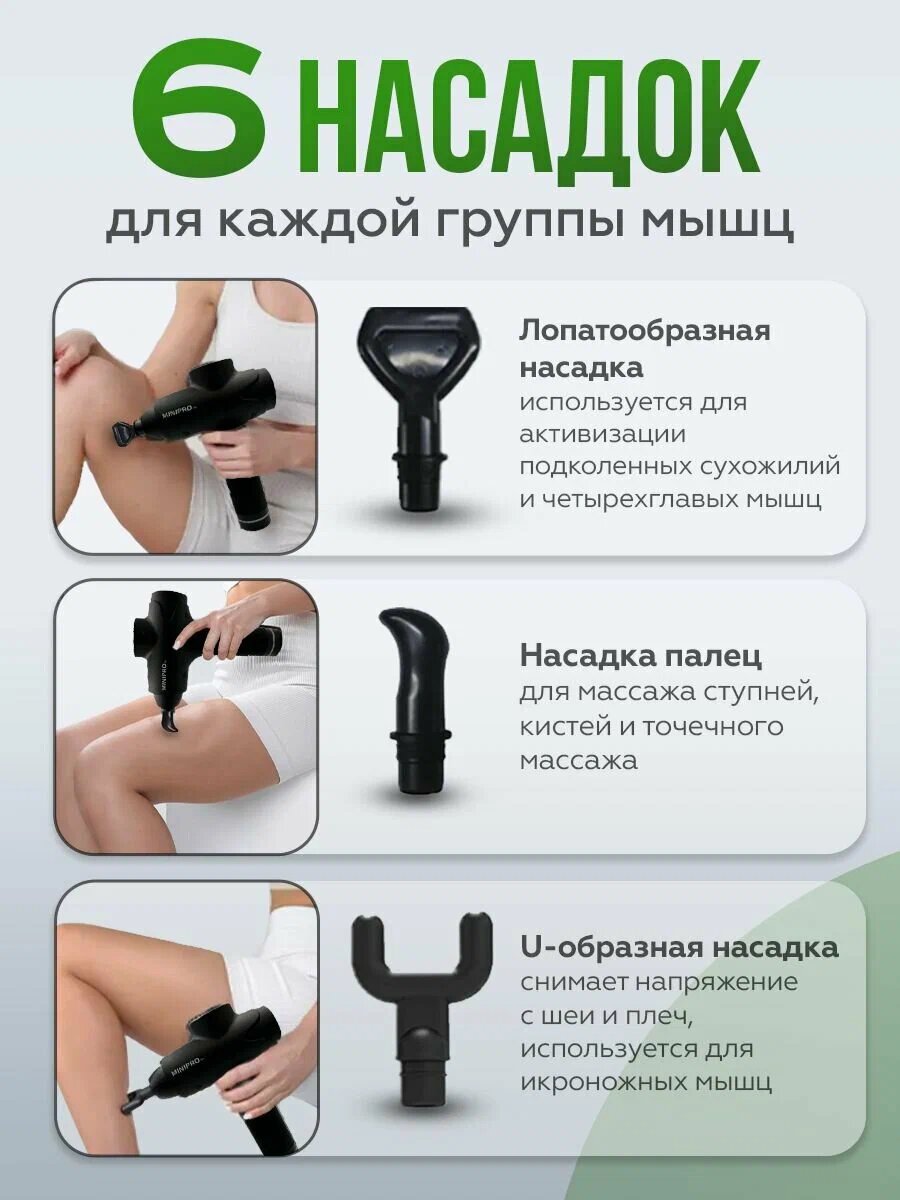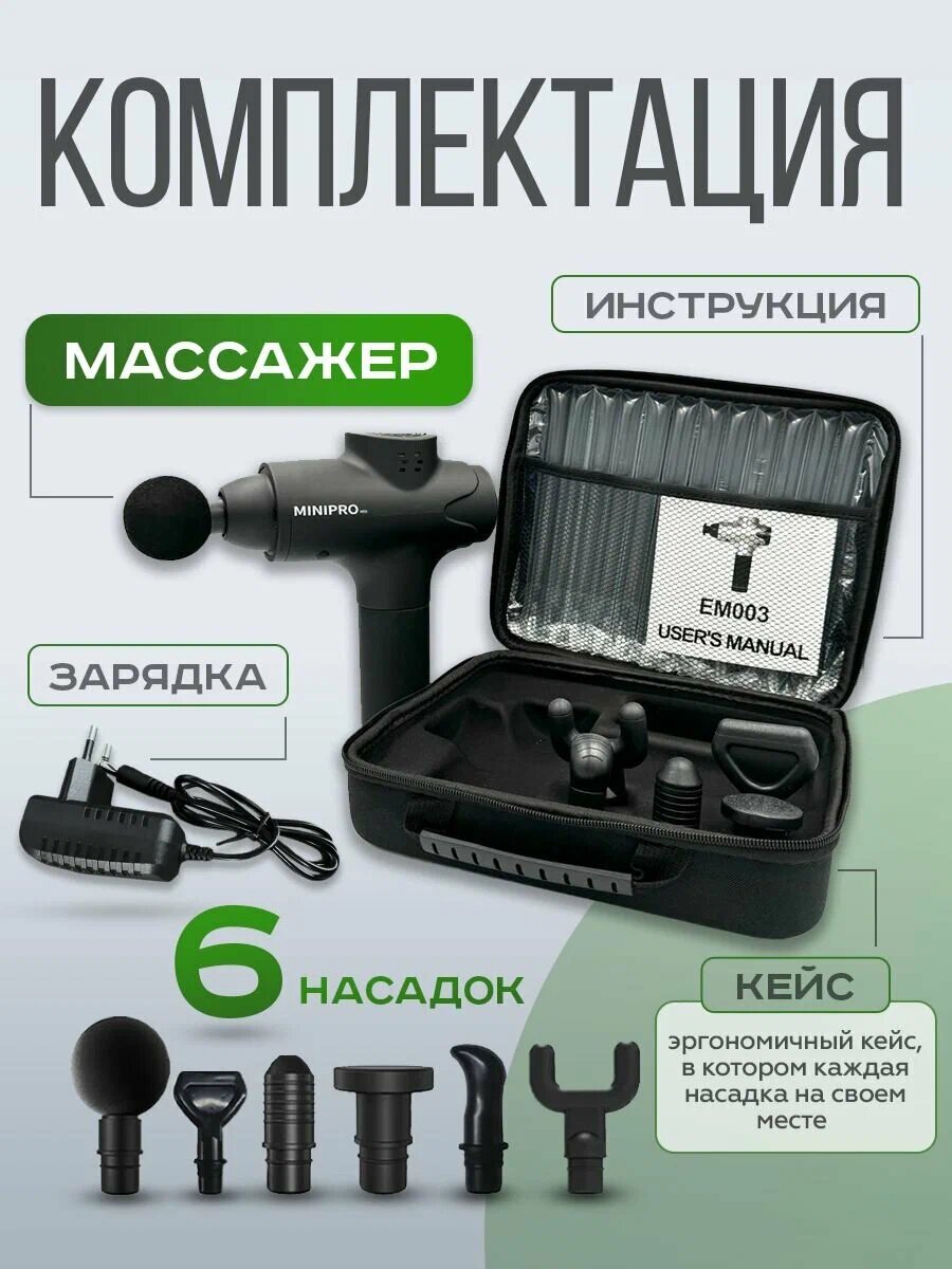 Массажный пистолет - 1 шт, насадки - 6 шт, инструкция на русском языке - 1 шт, кейс для хранения - 1 шт, кабель для зарядки - 1 шт