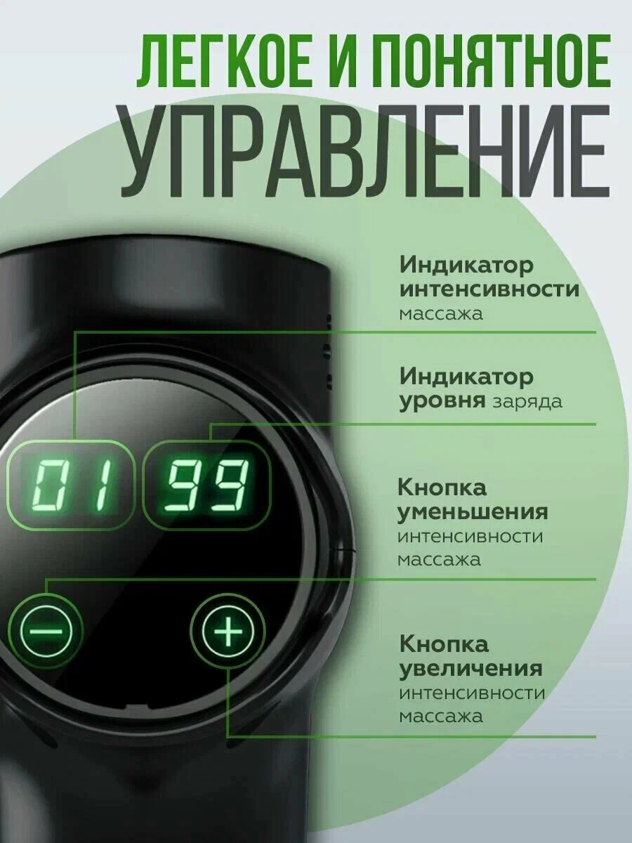 Массажëр подходит на все группы мышц, есть сменные насадки, силовые уровни мощи разные, работает исправно