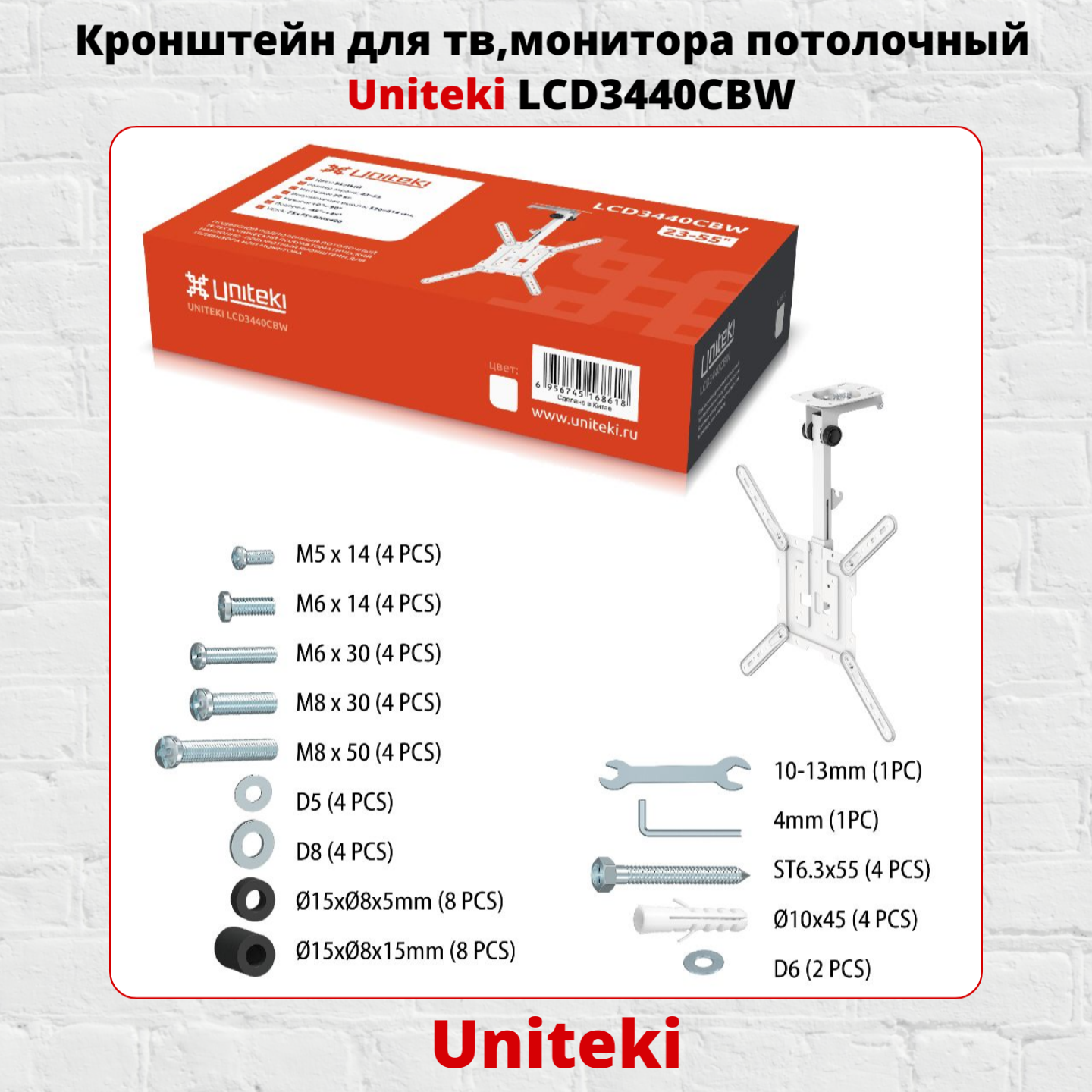 Кронштейн крепление для телевизора потолочный подполочный наклонно поворотный диагональ от 17 до 42 дюймов UniTeki LCD3440CBW белый