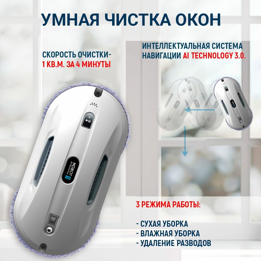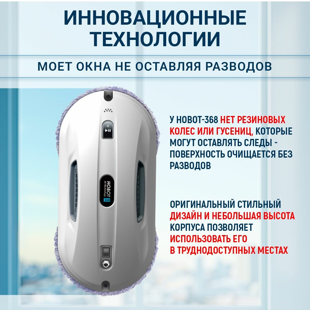 В итоге остановила свой выбор на Hobot 368. Работает быстро, в комплекте 6 пар чистящих салфеток-насадок. Но я докупила ещё 1 комплект из 6 пар салфеток, так как менять их надо сразу, как только робот 1 раз помыл 1 окно, иначе пойдут разводы от грязной салфетки. Мощный, гарантия 3 года |