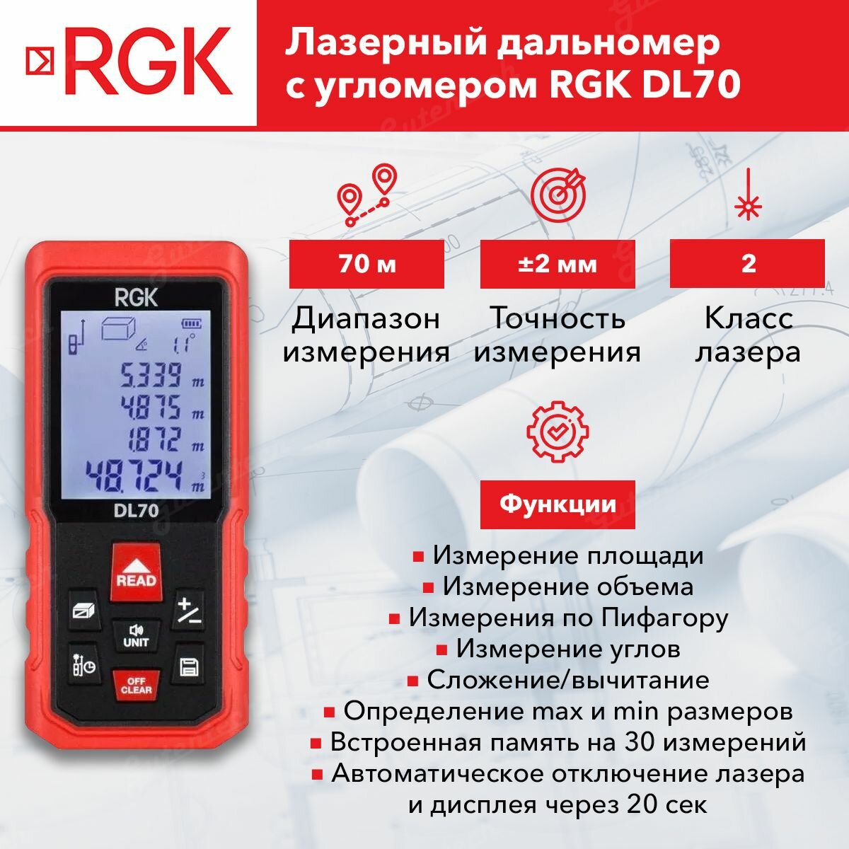 Лазерный дальномер с угломером RGK DL70, 70м, Госреестр, ±2 мм (арт. 4610011873911)