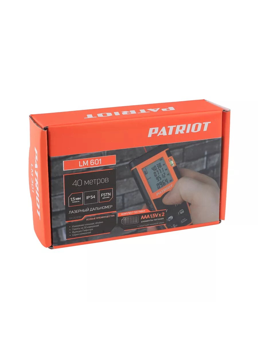 Строительный дальномер лазерный PATRIOT LM 401 с подсветкой / макс. дистанция 40 м / измерение площади и объема / с чехлом в комплекте