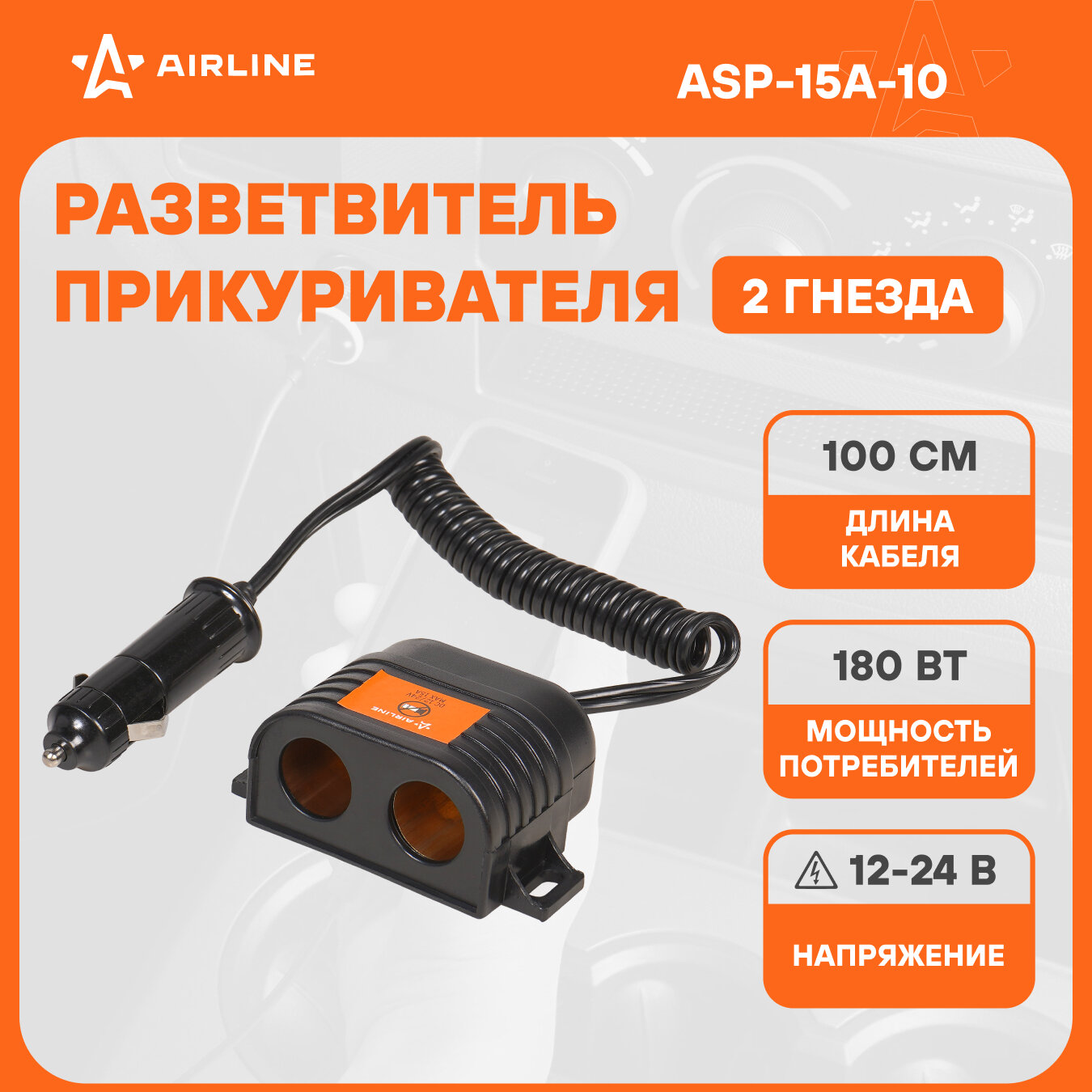 Купить AIRLINE ASP15A10 Прикуриватеь-разветвитеь 2 гнезда 15А с витым шнуром (ASP-15A-10)