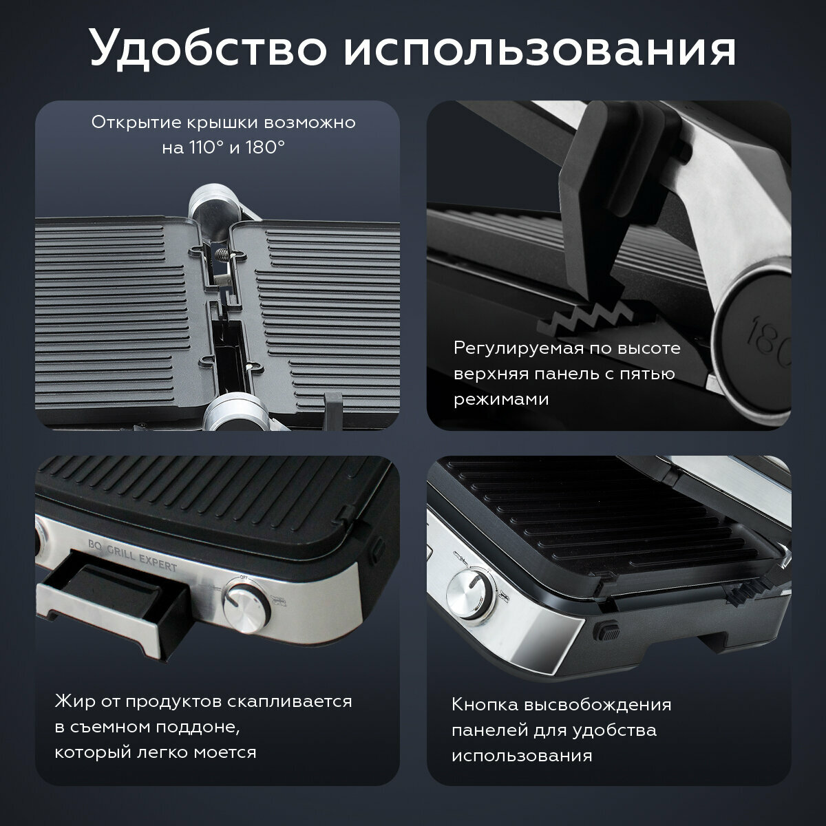 Электрогриль BQ GR1002 Черно-серебристый / Мощность 1800 Вт / Антипригарное покрытие / Регулировка температуры