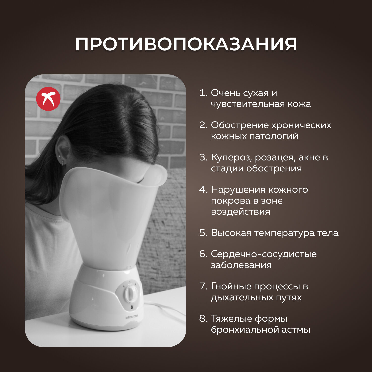 | Противопоказания | перед использованием сауны проконсультируйтесь с врачом в следующих случаях: при лихорадке; при гнойничковых заболеваниях на коже лица; при наличии раздражений на коже лица; при сильных болях; во время приема лекарственных и обезболивающих средств; при наличии ран или заболеваний в области лица |
