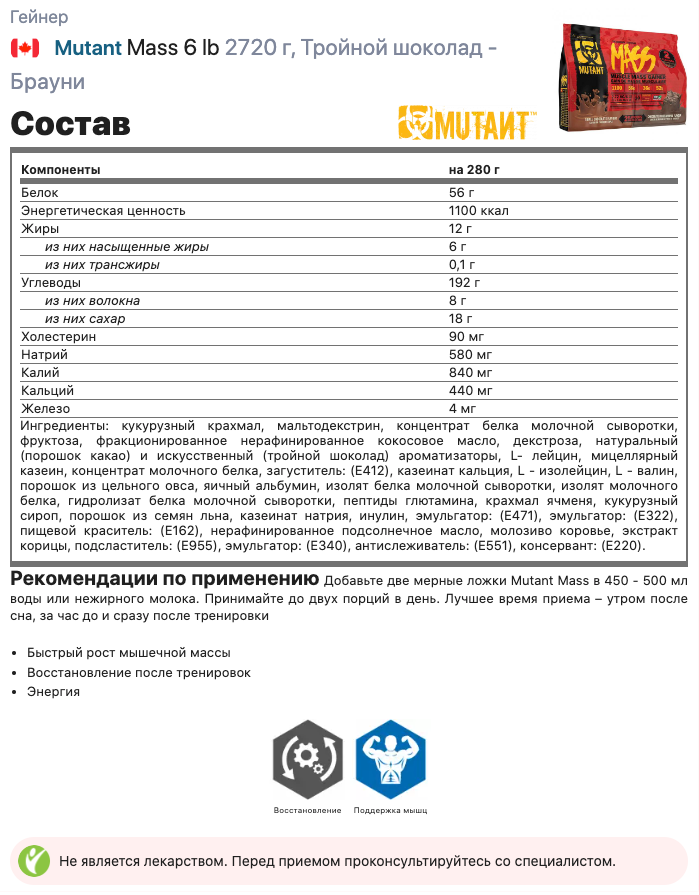 Ниже Вы можете прочитать отзывы на Гейнер для набора массы Mutant Mass 2720 гр Тройной шоколад и брауни с шоколадной помадкой, ознакомится с подробными характеристиками, посмотреть интересные обзоры и фотографии на Гейнер для набора массы Mutant Mass 2720 гр Тройной шоколад и брауни с шоколадной помадкой.
