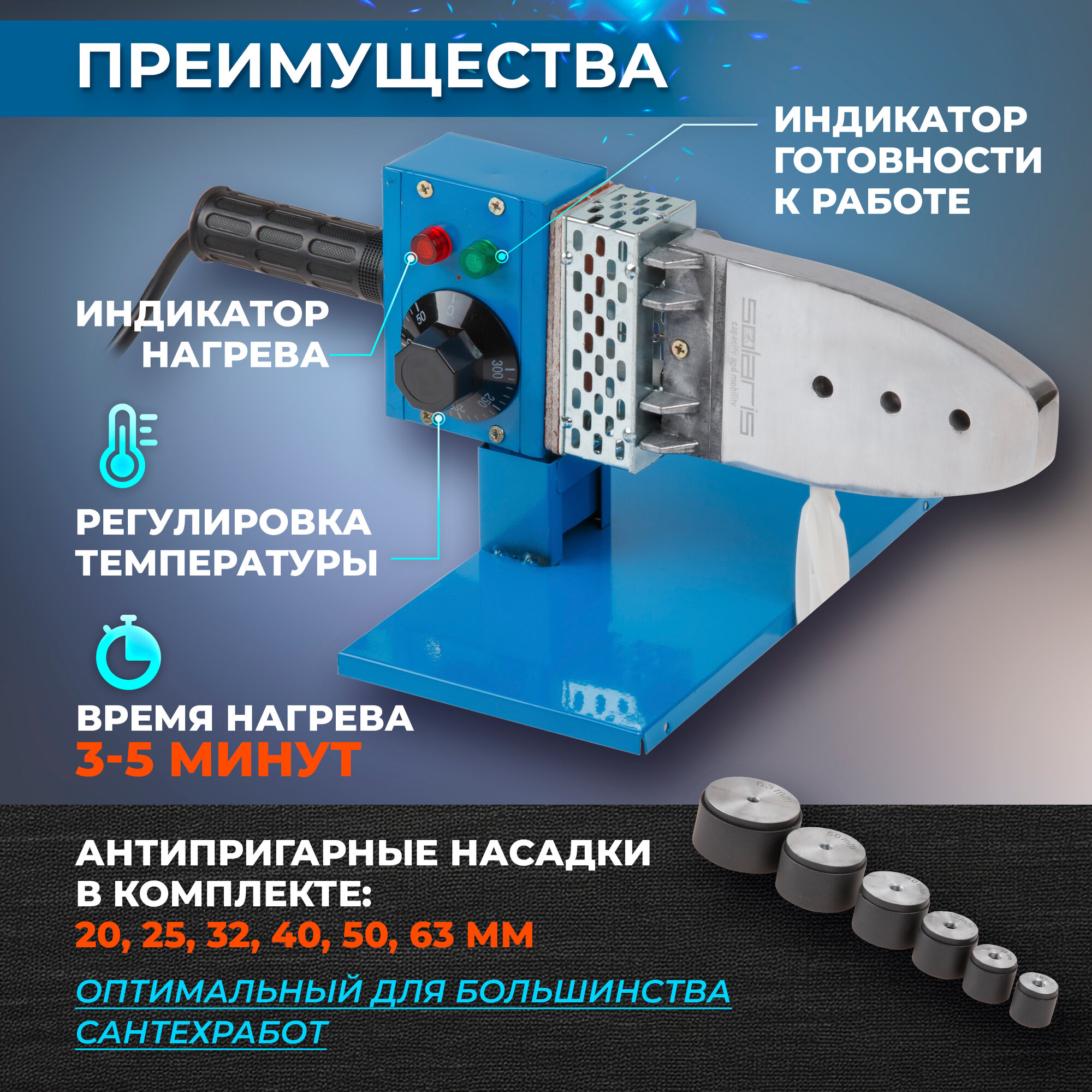 Сварочный аппарат для полимерных труб Solaris PW-1002 (1000-1100 Вт, 6 насадок: 20, 25, 32, 40, 50, 63 мм) (SOLARIS)