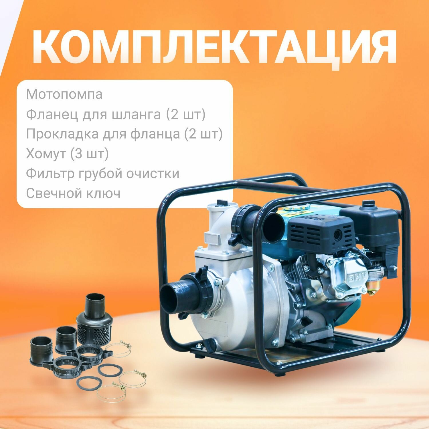 | Комплектация | прокладка (2 шт.), фланец всасывающего шланга, фланец напорного шланга, гайка фланца (2 шт.), хомут (3 шт.), фильтр грубой очистки, руководство по эксплуатации |