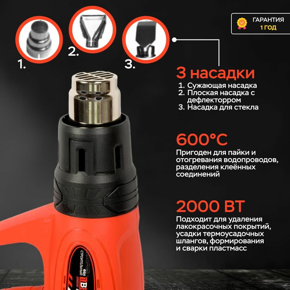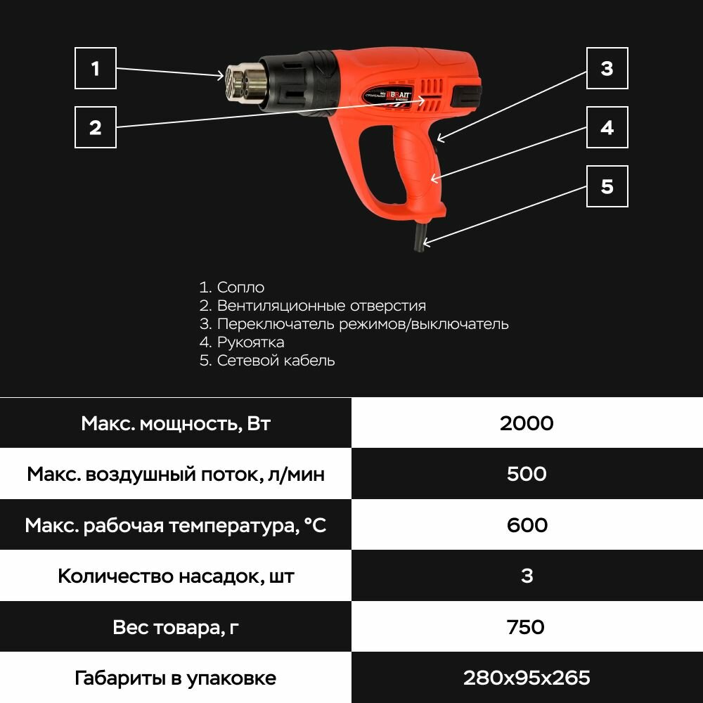 Фен технический BRAIT BHG2000N 2000 Вт, макс. темп. 485 С, 2 скорости, 3 насадки