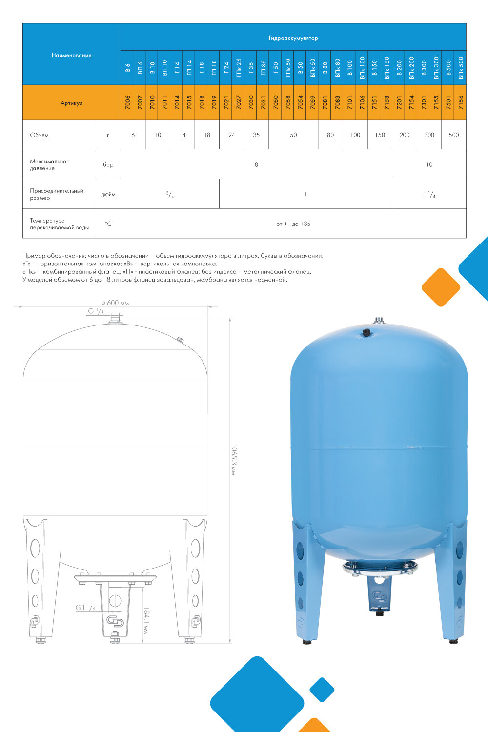 Гидроаккумулятор Джилекс 200 В, Вертикальный, для водоснабжения, арт.7201
