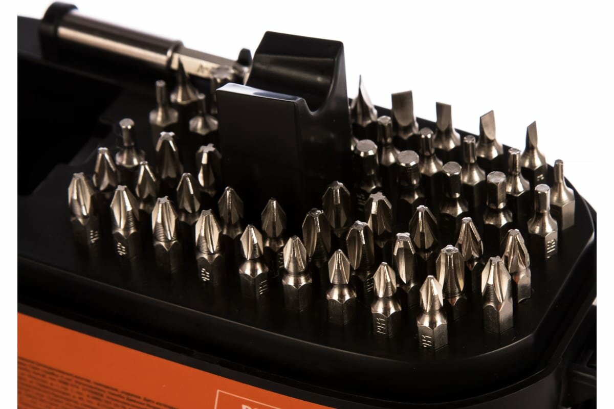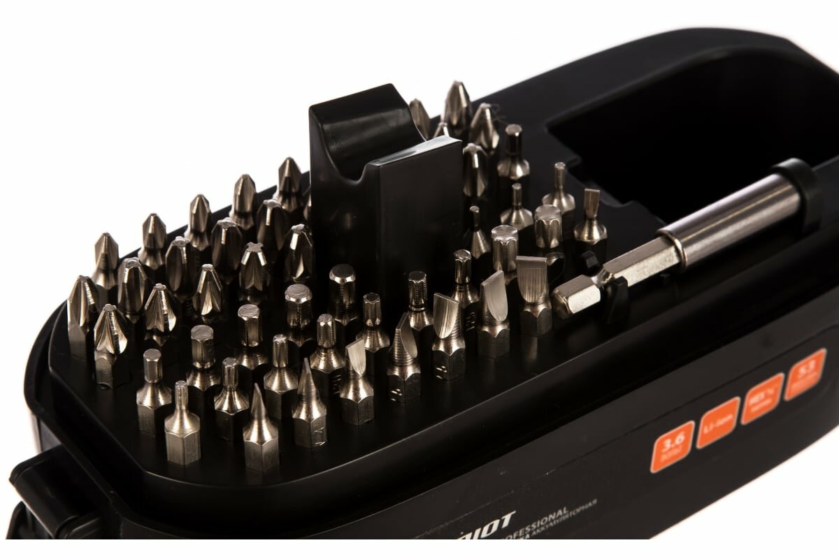 | Комплектация | отвертка аккумуляторная, зарядное устройство, набор бит (52 шт.), удлинитель для бит с магнитным наконечником, инструкция по эксплуатации |