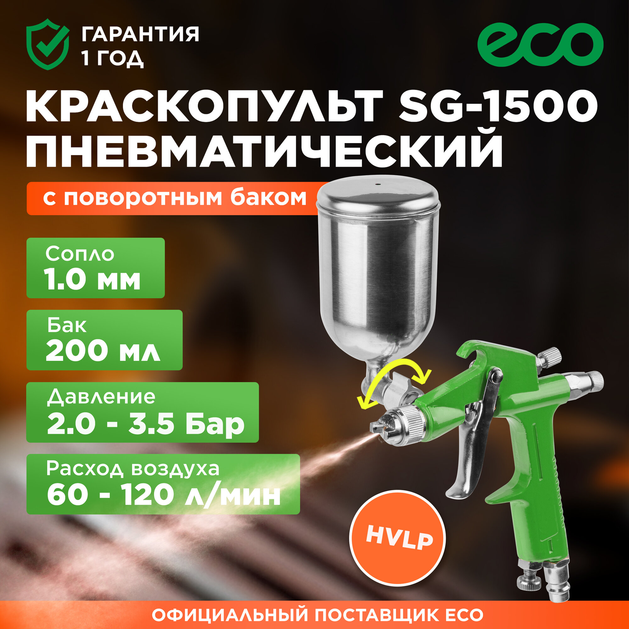 Краскораспылитель ECO SG-1500 (сопло ф 1.0 мм) (HVLP, сопло ф 1.0 мм, поворотн. бак 200 мл) (EC1530-10)