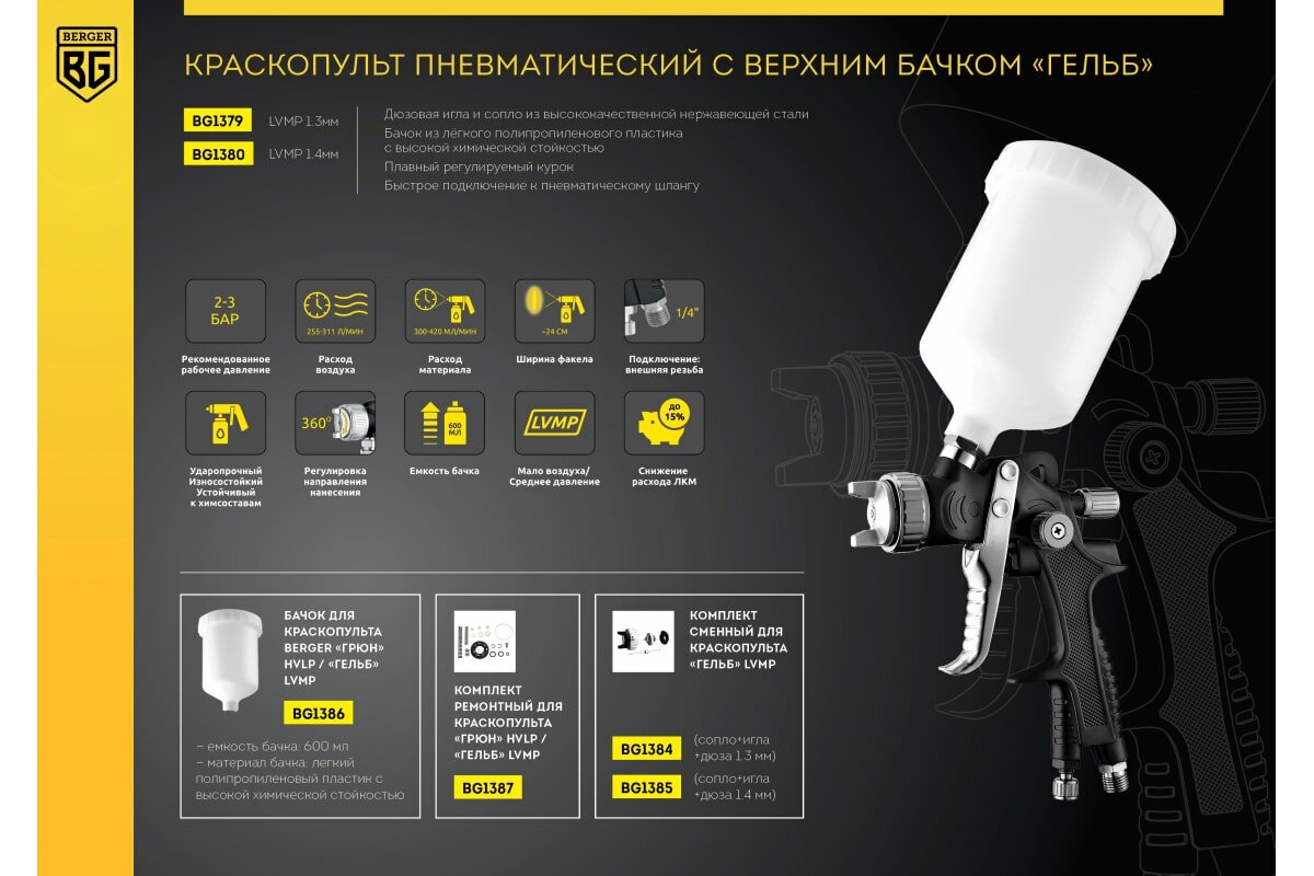 СохранитьКраскопульт пневматический BERGER "гельб" LVMP 1.4 мм BG1380 интересное: