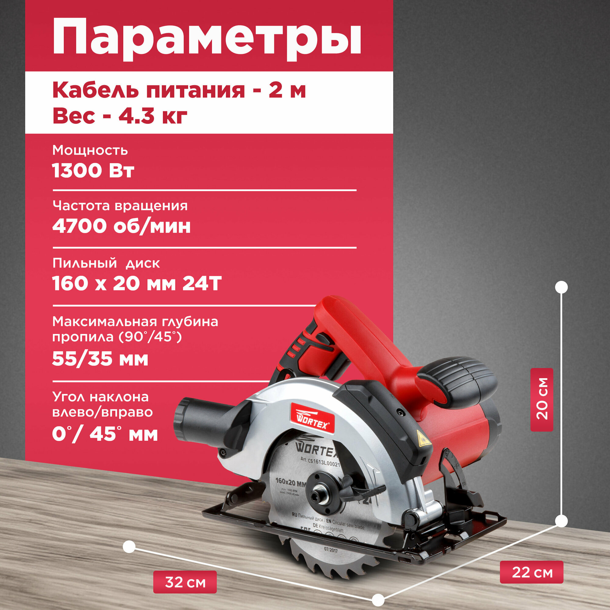 Дисковая пила Wortex Пила циркулярная WORTEX CS 1613 L (CS1613L00021), 1300 Вт