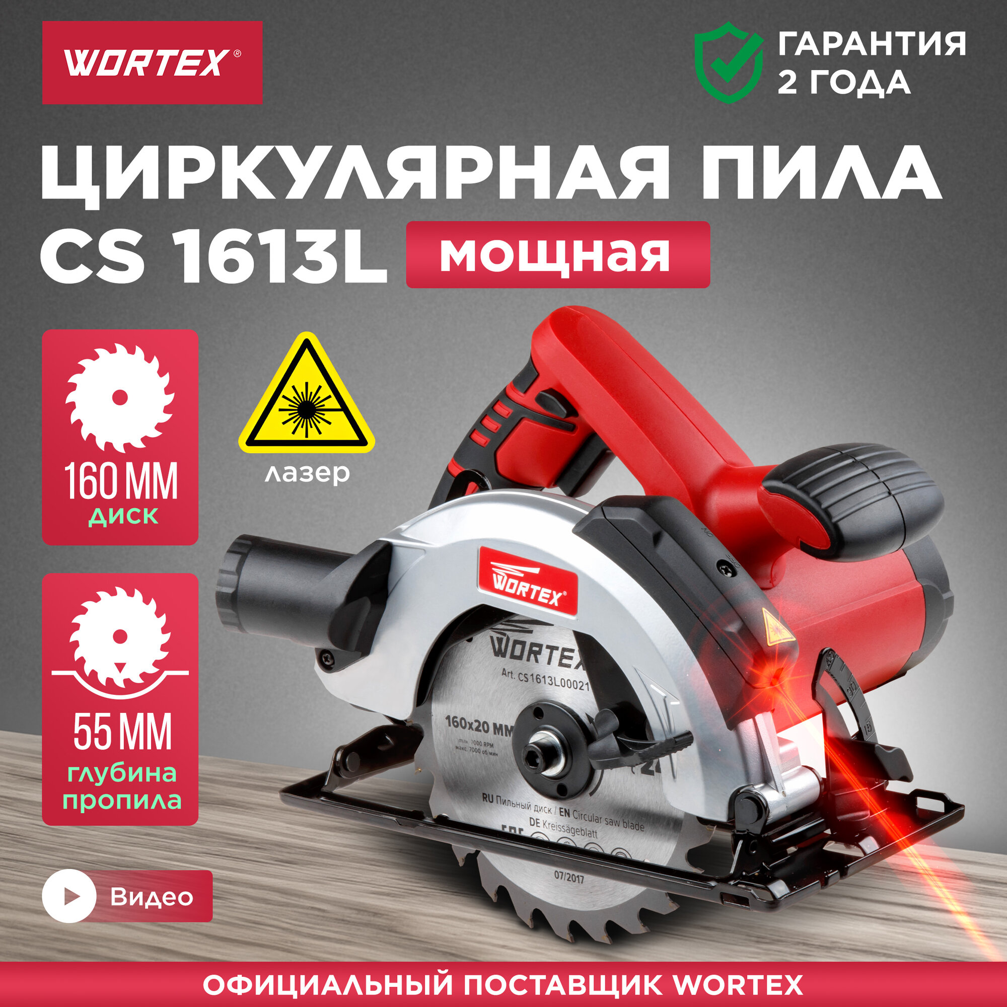 Пила циркулярная WORTEX CS 1613 L 1300Вт, 160х20мм, до 55мм, 4.3кг. лазер CS1613L00021