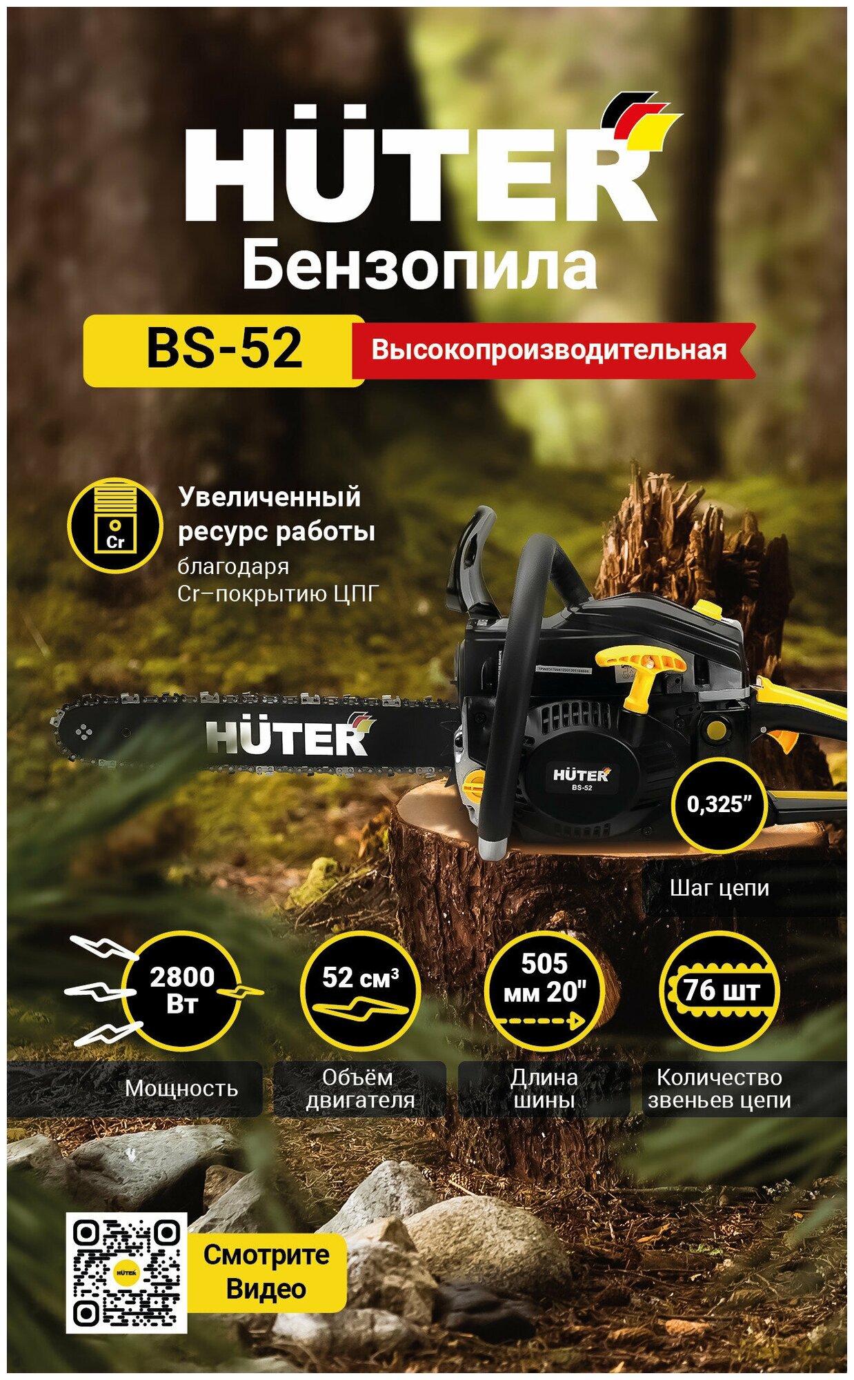 Бензопила BS-52M Huter (52см3, 3,8лс, 18", 1,5мм*72зв, шаг 0,325")
