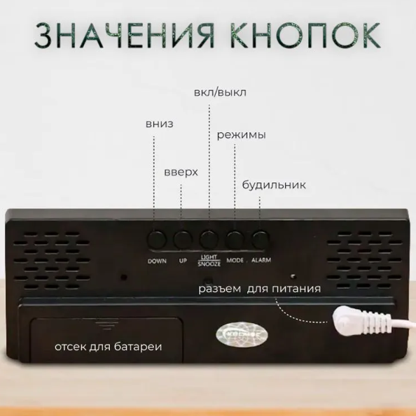 | Минусы: | Батарейки (энерджайзер) ,,сжирает,, за несколько дней, при том, что автоматически включается спящий режим. Реакция на движения и звук для выхода из спящего режима очень средняя. Не надейтесь разбудить часы, если вы сами ещё не проснулись.