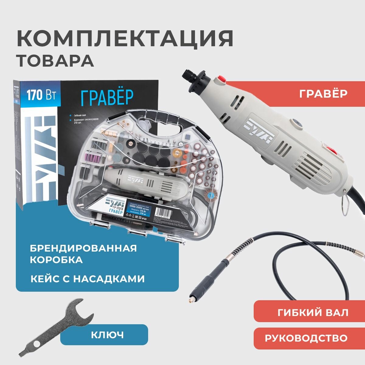 | Комплектация | гибкий вал, набор насадок 210 шт, кейс, ключ, инструкция, гарантийный талон |
