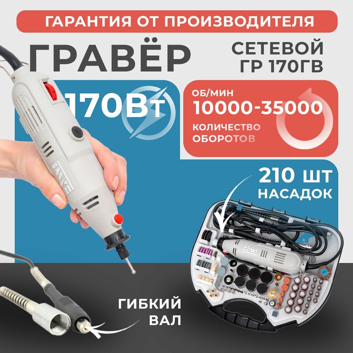 ГР 170ГВ Гравер 170Вт, гибкий вал, 10000-35000об/мин булат