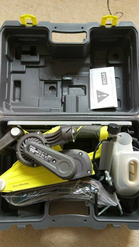 | Плюсы: | Ранее использовалась шлифмашинка DeWalt 433 (в данный момент в ремонте). Эта легче DW433 на пару кило, удобнее при равной мощности и чуть меньшей скорости ленты. В плюс: возможность использования в качестве гриндера, наличие съёмной платформы для шлифовки больших поверхностей без завала машинки, маленький диаметр переднего ролика (удобно подлезть поближе к стенке). Индикатор подключения к сети - так себе "прибамбас", а вот наличие кейса - это дело. То, что машинка полностью из пластика - покажет дальнейшая эксплуатация: плюс это или минус. Неплохо работает пылесборник циклонного типа, к тому же его легко очистить от пыли, т.к. выполнен пластиковой коробкой с фильтром и задней крышкой. |