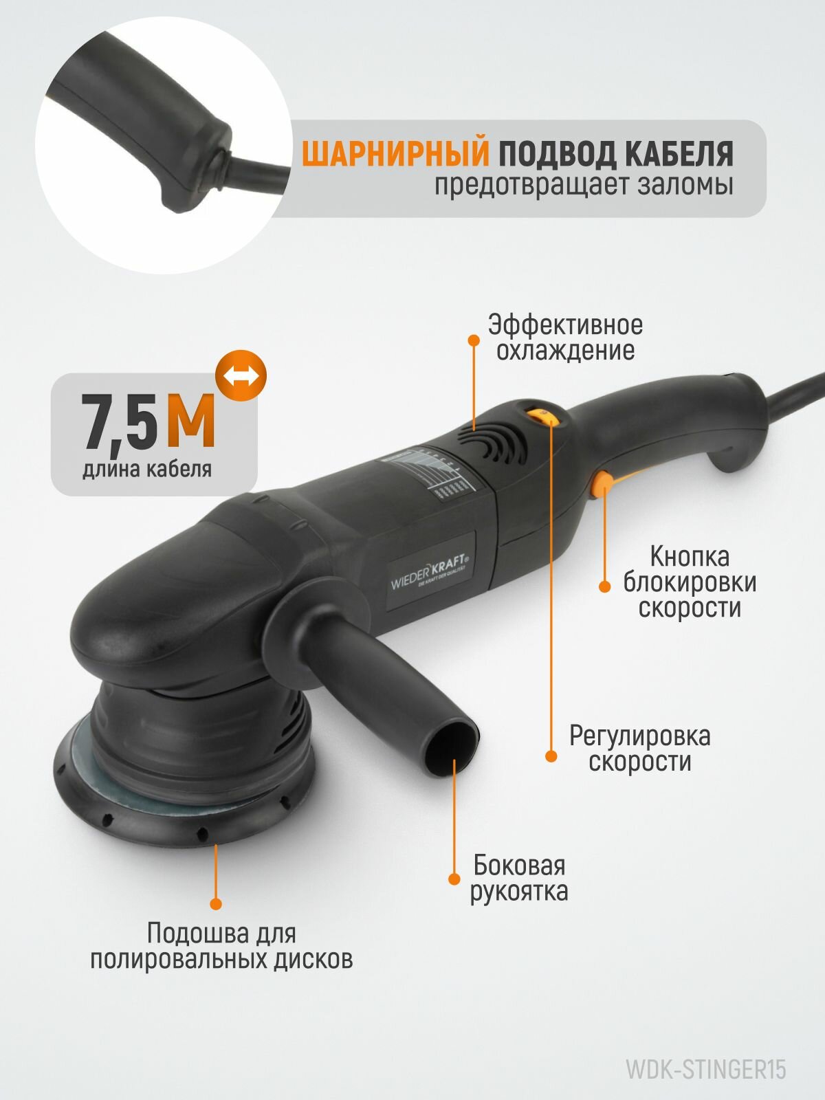 WIEDERKRAFT Полировальная машина ротор-орбитальная электрическая, 220в, с подошвой 150 мм WDK-Stinger21-150