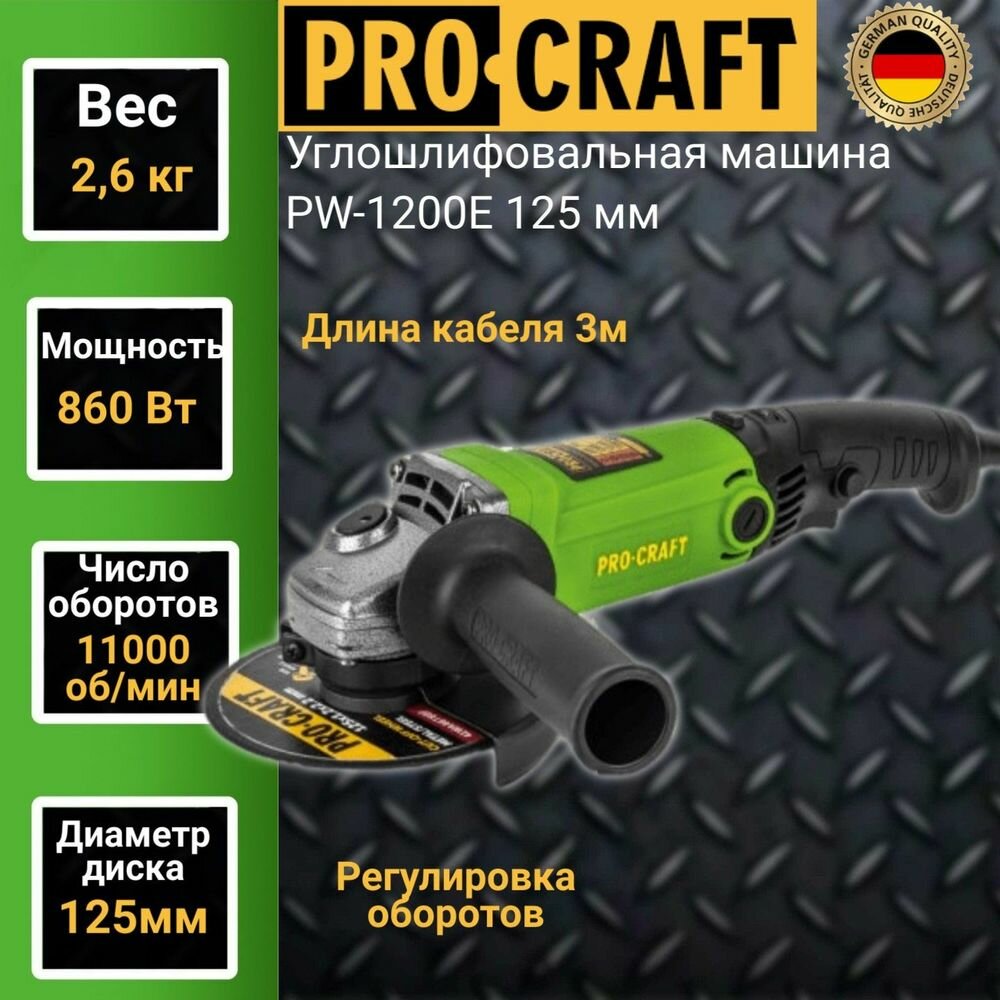 Болгарка 125 мм 860 Вт электрическая сетевая PROCRAFT PW1200E ушм с регулировкой оборотов