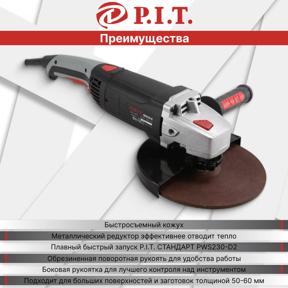 Шлифмашина угловая PWS230-D2 стандарт (230мм, 2,3кВт, плавный пуск, поворотная ручка) P.I.T. PWS230-D2, 2300 Вт