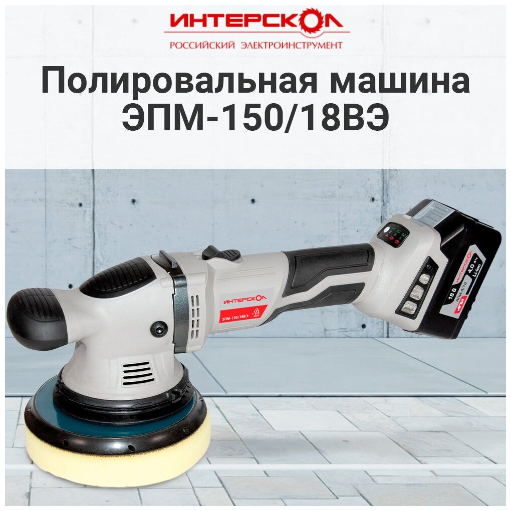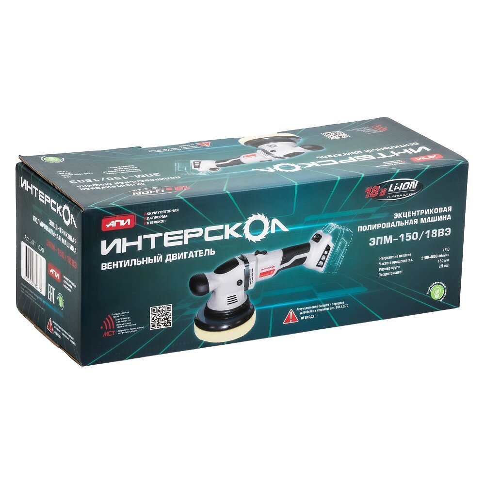 Бесщеточная профессиональная аккумуляторная полировальная машина Интерскол ЭПМ-150/18ВЭ (картон, без аккум. и ЗУ)