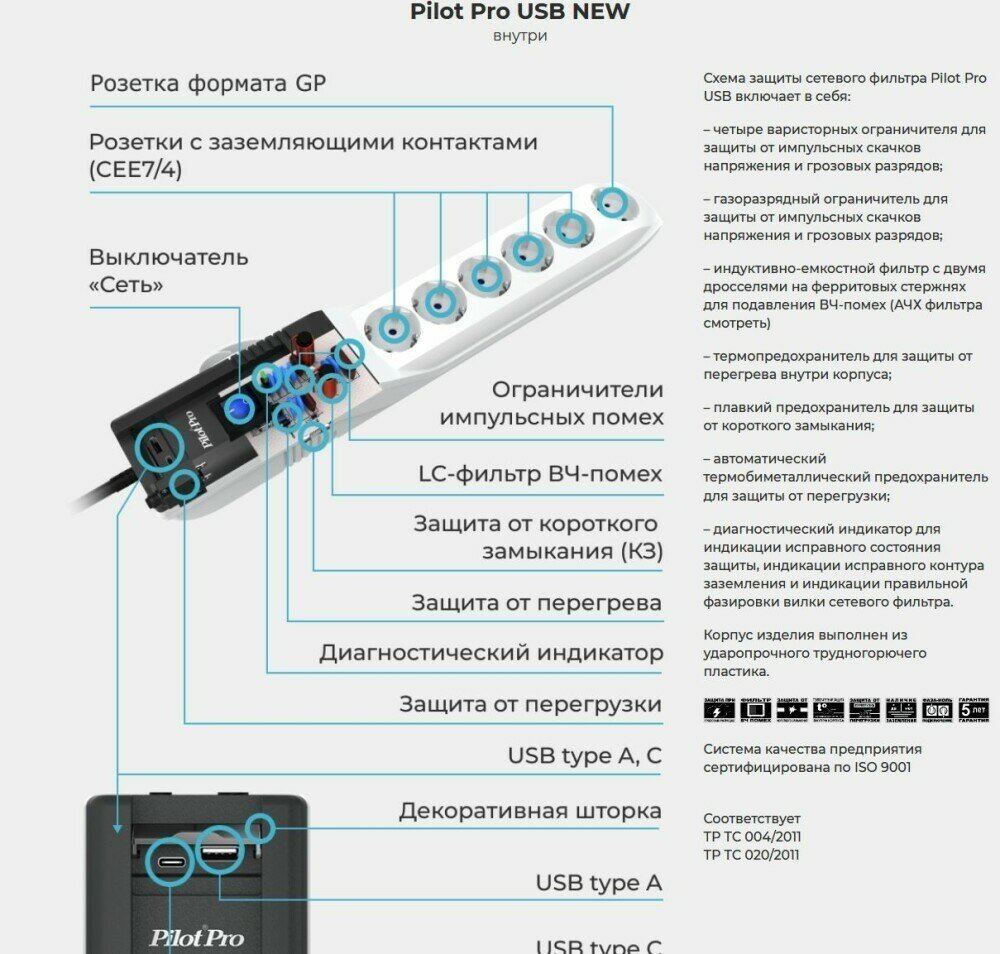 Сетевой фильтр Pilot Pro USB 5m, 6 розеток (5 евро + 1 GP ), USB 3A type A / C, защитные шторки, белый, 5 метров