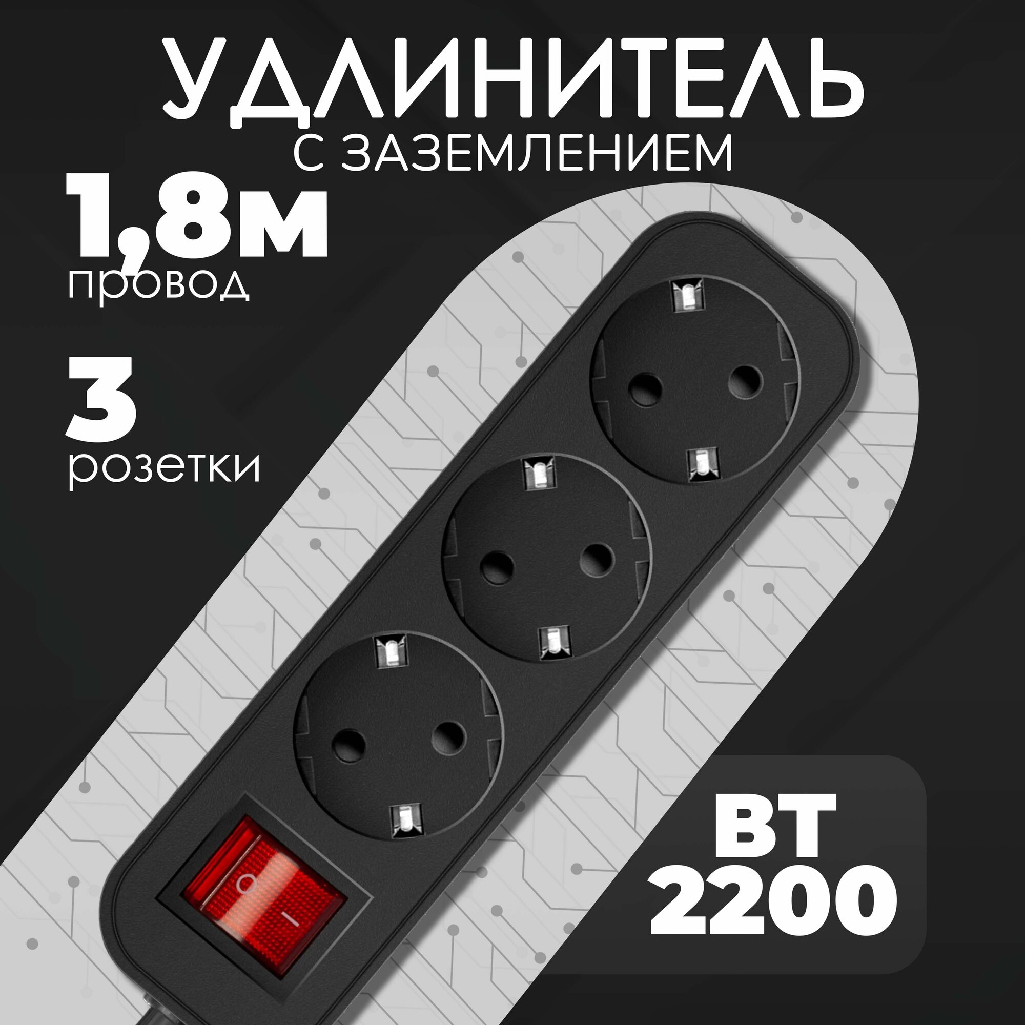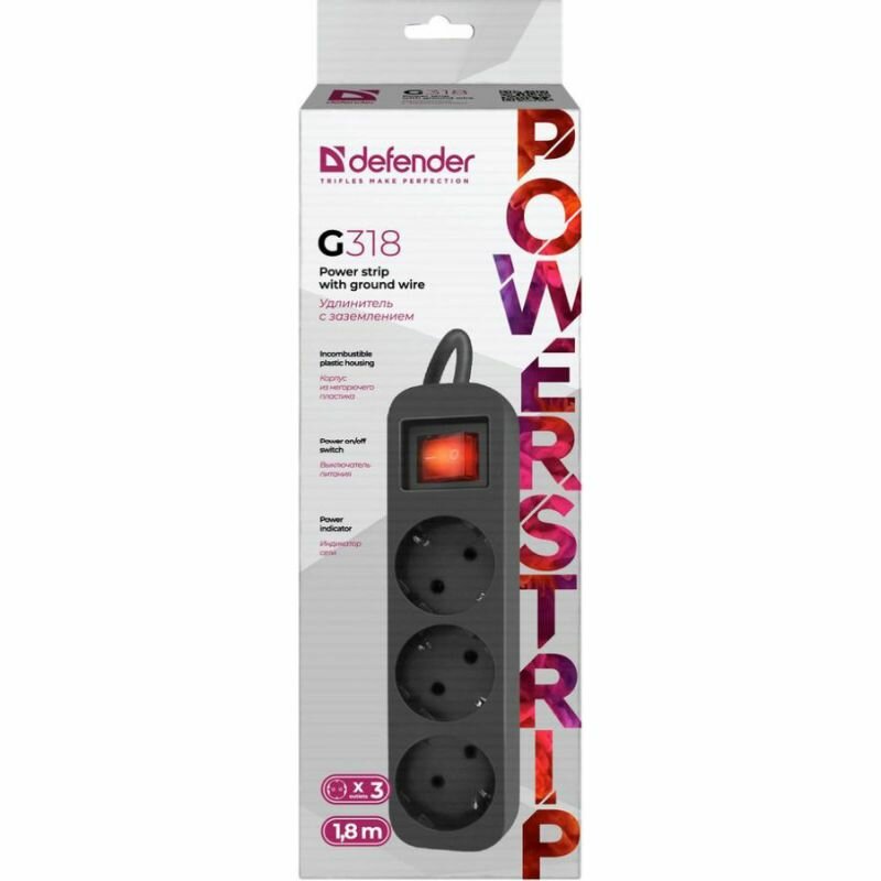 Сетевой удлинитель с выключателем Defender G318, 3 розетки, 1.8 м, с/з, 10А, 2200 Вт, черный