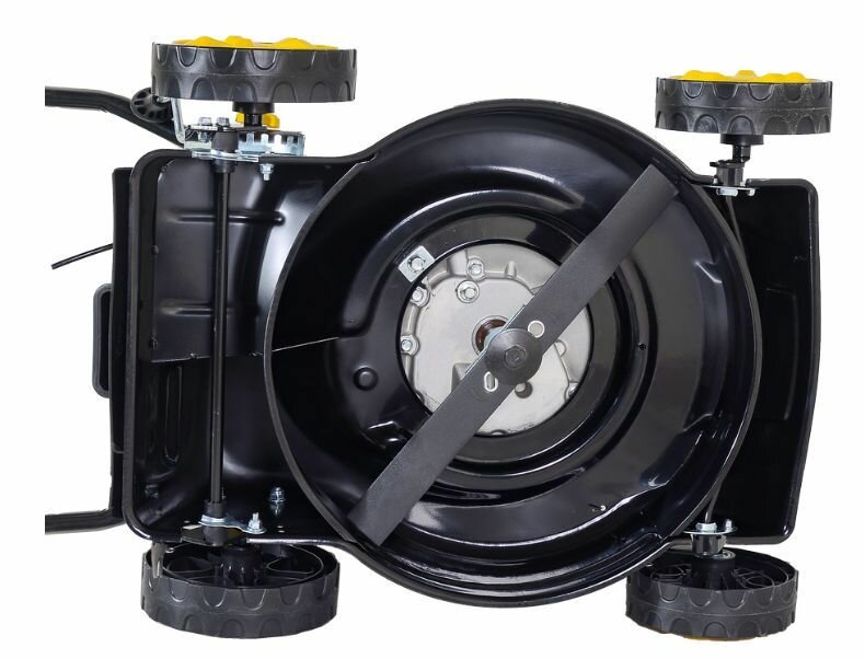 Газонокосилка оказалась с браком - криво стоит переднее левое колесо. На высоте 1 не сильно заметно но если переключить на самое высокое положение то явно видно. Рекомендую проверять при покупке сразу.