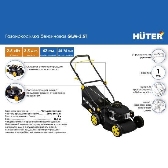 Ниже Вы можете прочитать отзывы на Газонокосилка бензиновая HUTER GLM-3.5T, 4 л.с, ширина скоса 42см, тканевый травосборник, ознакомится с подробными характеристиками, посмотреть интересные обзоры и фотографии на Газонокосилка бензиновая HUTER GLM-3.5T, 4 л.с, ширина скоса 42см, тканевый травосборник.