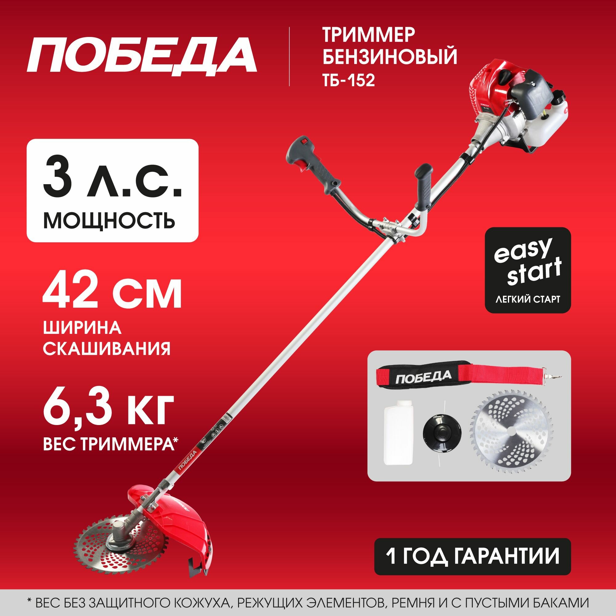 Триммер бензиновый Победа ТБ 152, раб. объем 52сс, 3,0 л.с., велосипедная рукоятка, катушка с леской, 40 зуб., нож 255 мм / бензотриммер