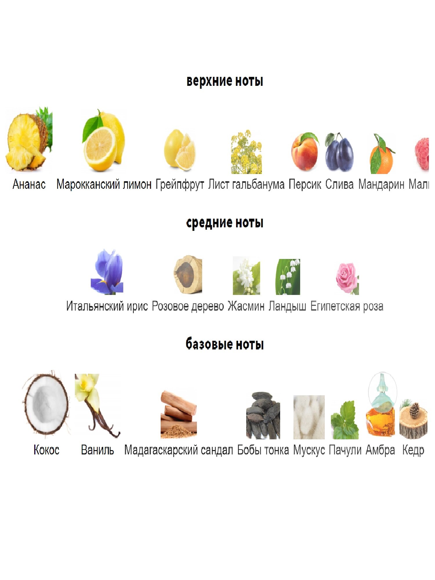 | Верхние ноты | марокканский лимон, ананас, слива, лист гальбанума, мандарин, персик, грейпфрут, малина |