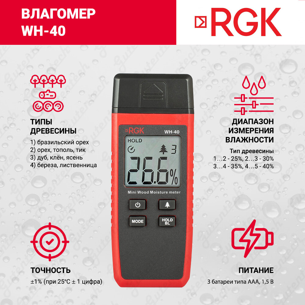 Ниже Вы можете прочитать отзывы на Влагомер древесины RGK WH-40, ознакомится с подробными характеристиками, посмотреть интересные обзоры и фотографии на Влагомер древесины RGK WH-40.
