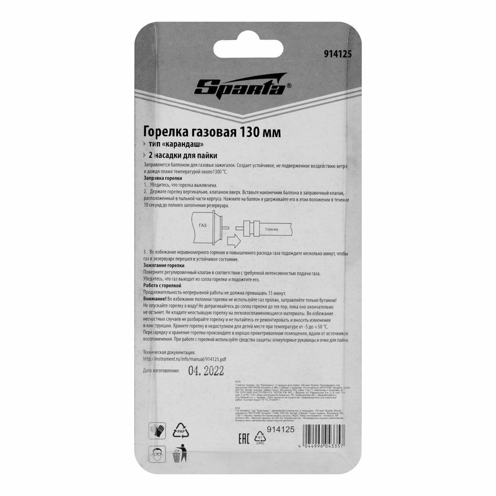 Горелка газовая Sparta 914125, тип "Карандаш", 2 насадки для пайки, 130 мм, бутан./В упаковке шт: 1