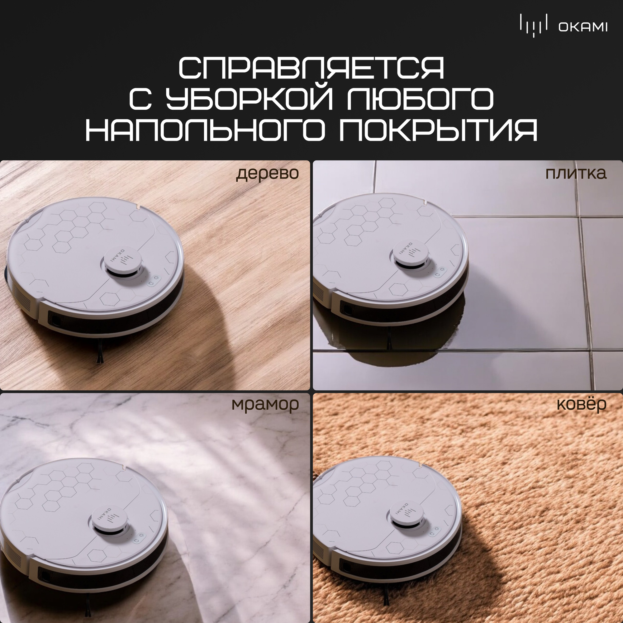OKAMI Робот-пылесос R117: Оками 6500 Па, подвижная турбощетка, автоматическая уборка с влажной протиркой и увеличение мощности на коврах