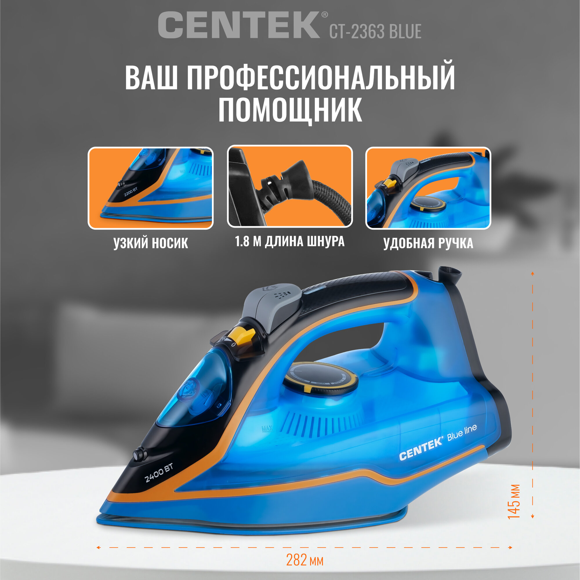 Утюг Centek Ct-2317, 2800 Вт, керамическая подошва, 300 мл, синий Centek 9519817 .