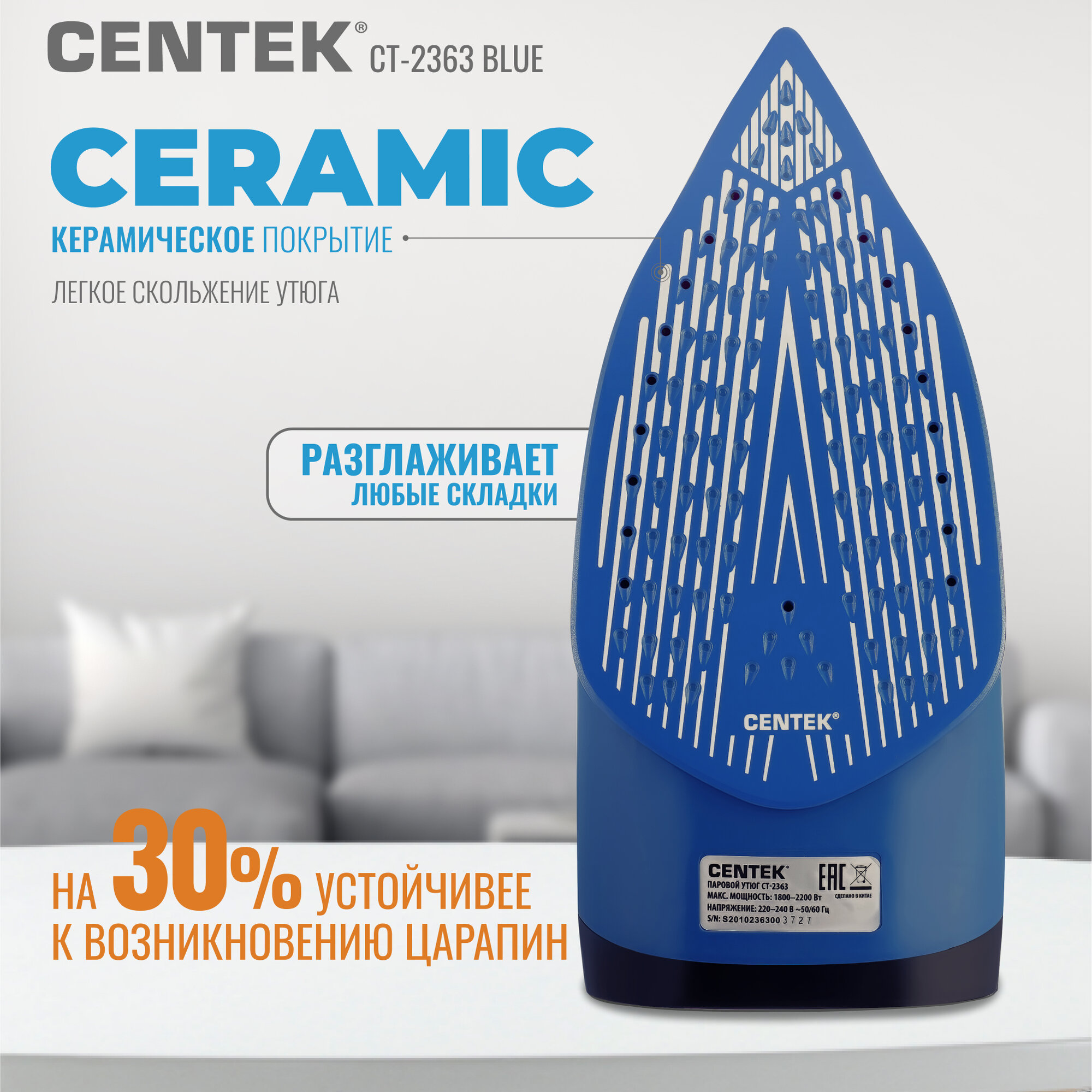 Утюг CENTEK CT-2317 Blue: 2800Вт, керамическая подошва, паровой удар, защита от накипи, автовыключение