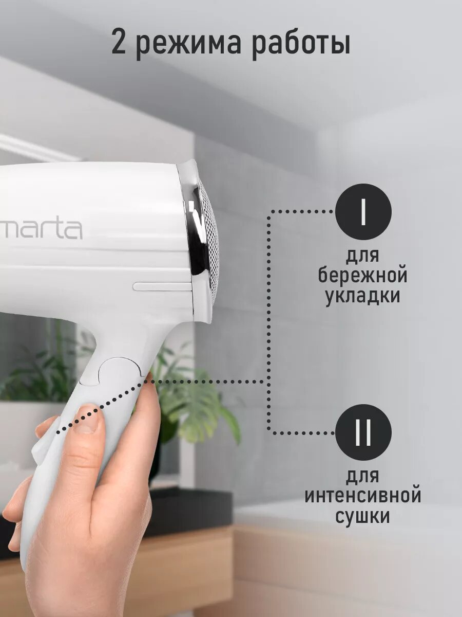Легкий и компактный фен, мои длинные волосы сушит быстро, волосы не повреждает. Есть разные скорости подачи теплого воздуха и функция подачи холодного воздуха, удобно взять с собой в дорогу, качество хорошее.