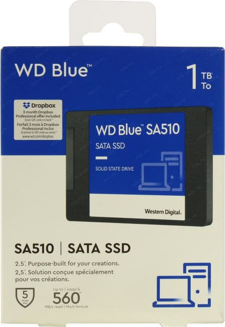 Твердотельный накопитель SSD Western Digital Blue SA510, 1.0TB, 2.5" 7mm, SATA3, R/W 560/530MB/s, IOPs 95 000/84 000, TBW 400, DWPD 0.2 (12 мес.)