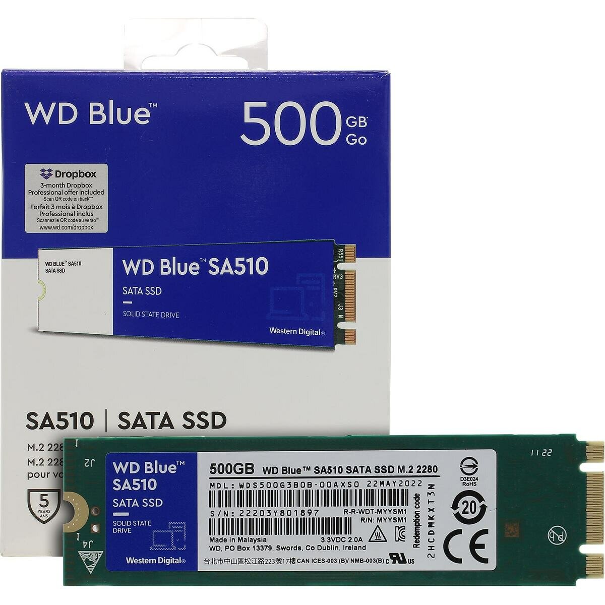 Твердотельный накопитель WD SSD Blue SA510, 500GB, M.2(22x80mm), SATA3, R/W 560/530MB/s, IOPs 95 000/84 000, TBW 200, DWPD 0.2
