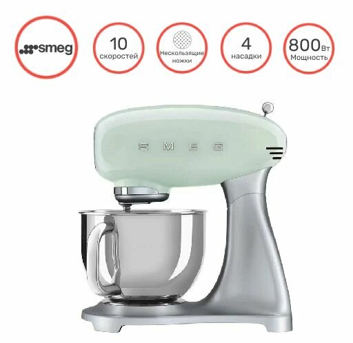 Миксеры SMEG/ Планетарный миксер, материал корпуса: литой алюминий, материал шестеренок: закаленная сталь, материал чаши: полированная нержавеющая сталь, цвет: пастельный зеленый