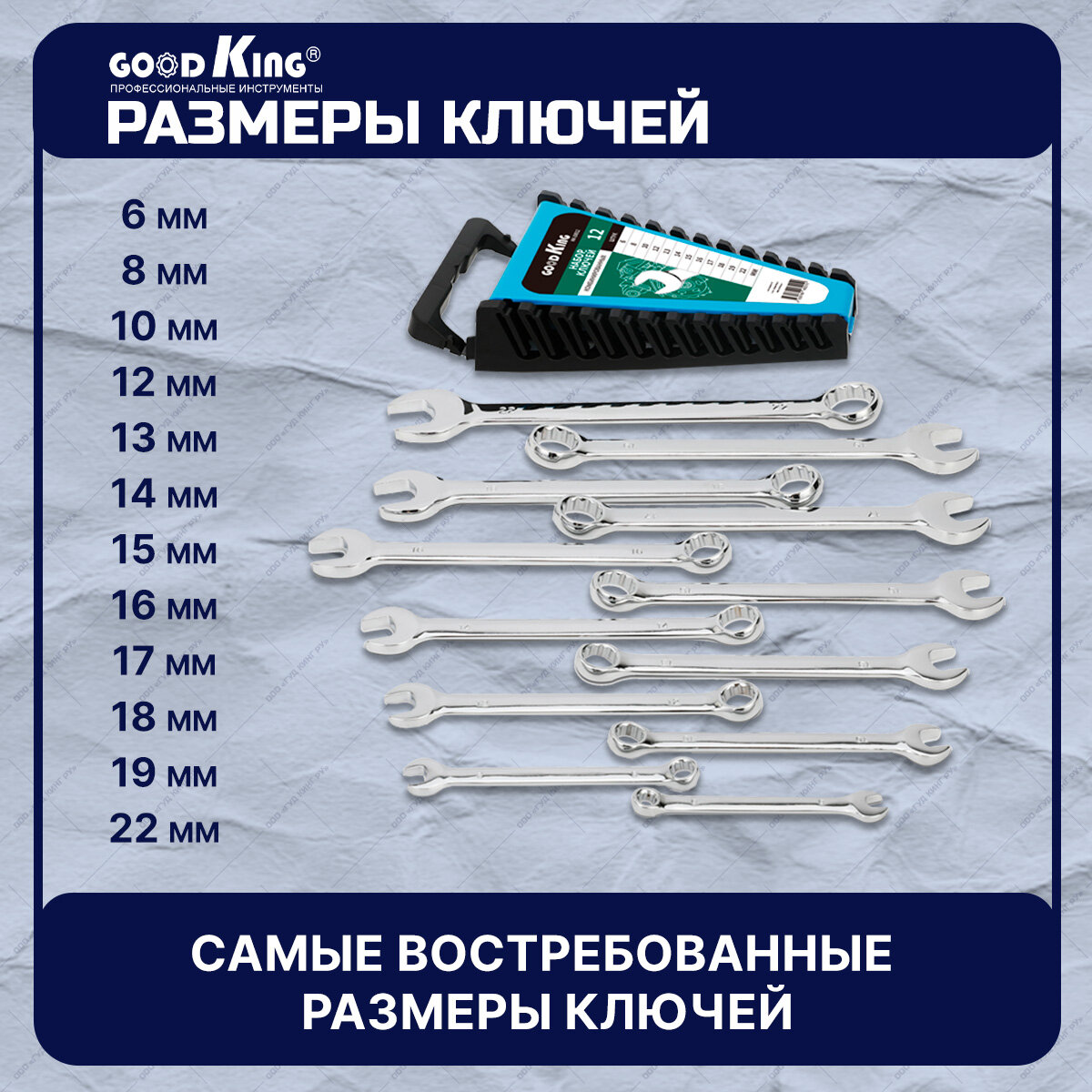 Набор ключей комбинированных GOODKING KK-10012, 12 предметов (6, 8, 10, 12, 13, 14, 15, 16, 17, 18, 19, 22 мм) в пластиковом держателе