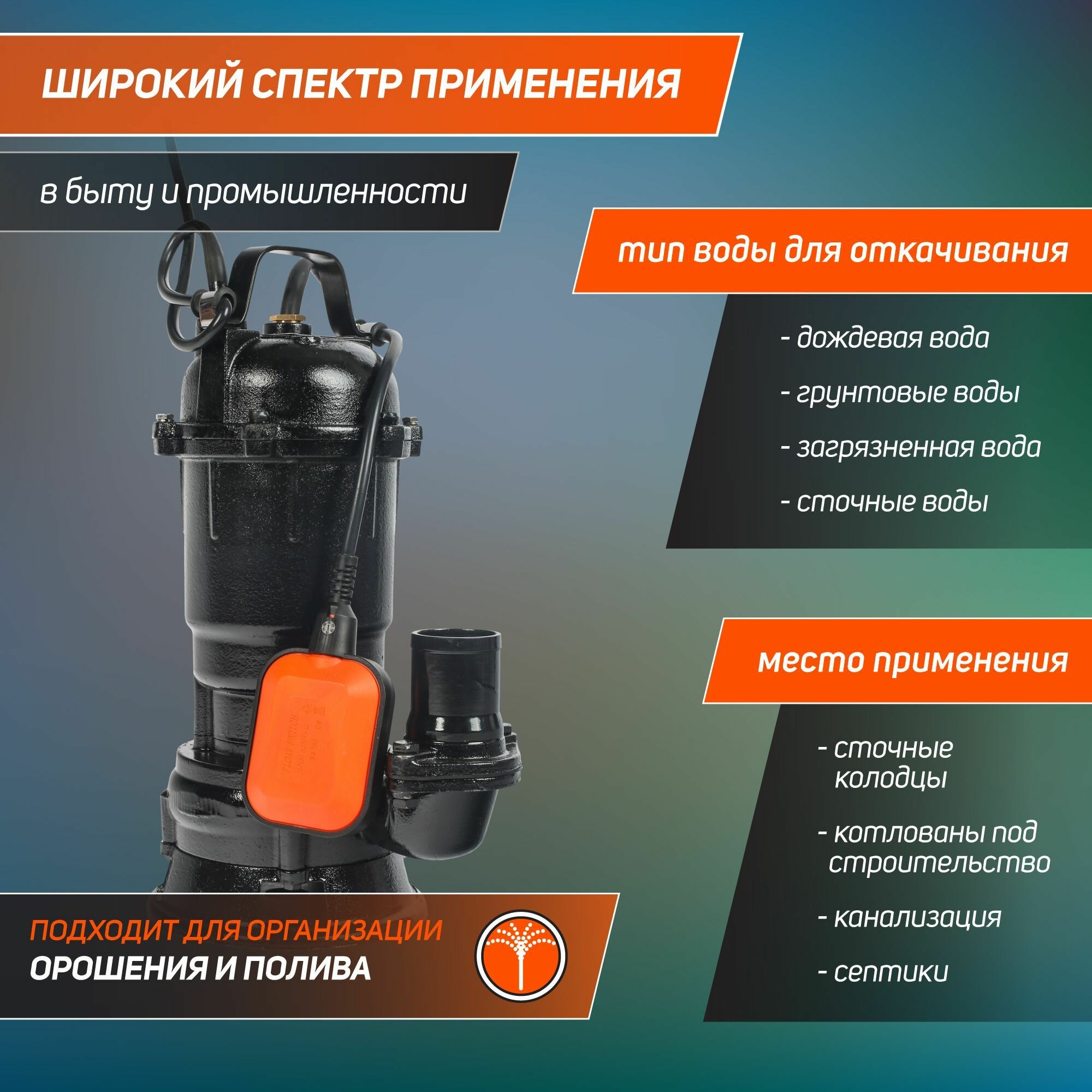 Насос PATRIOT FQ600С дренажный грязн.вода 600Вт, 4500л/ч корпус чугун, вес 15 кг.