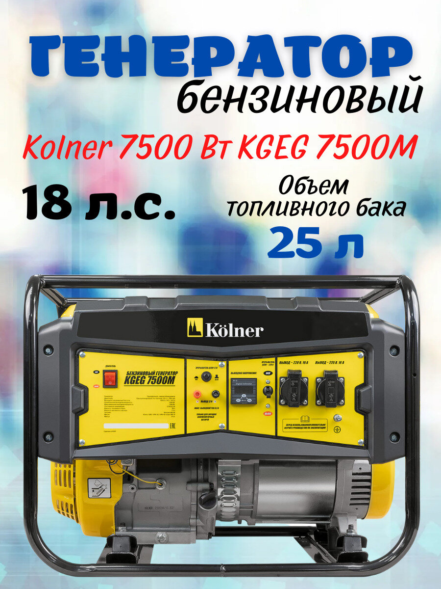 Купить Kolner KGEG 7500М (1шт) Генератор бензиновый 7500 Вт, однофазный, двигатель одноцилиндровый, 4-х тактный 18л.с (кн7500м)
