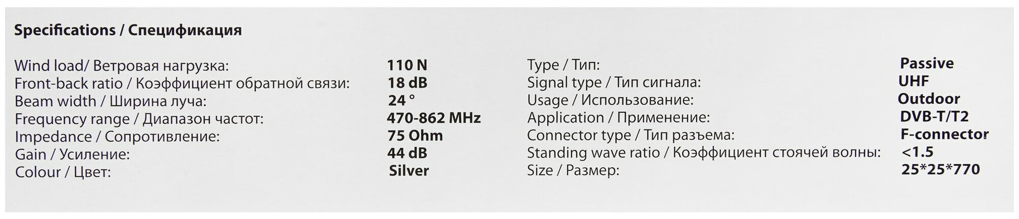 | Дополнительная информация | встроенный усилитель; комплектация: антенна, инструкция, хомут для крепления |